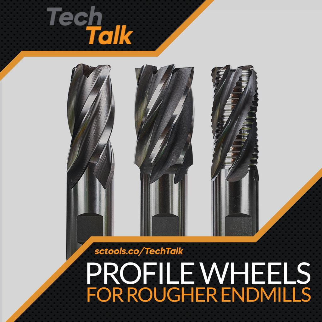 To grind a rougher endmill it requires the use of a profiled grinding wheel with a 1S1 FEPA shape. This profile grinding wheel must also be produced with an angle, "T" in harmony with the geometry of the rougher endmill or chip breaker tool. The grinding wheel parameters needed to correctly profile the wheel are: